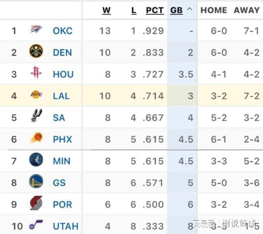 NBA最新积分榜:雷霆5连胜第1,掘金7连胜第2,湖人排第4